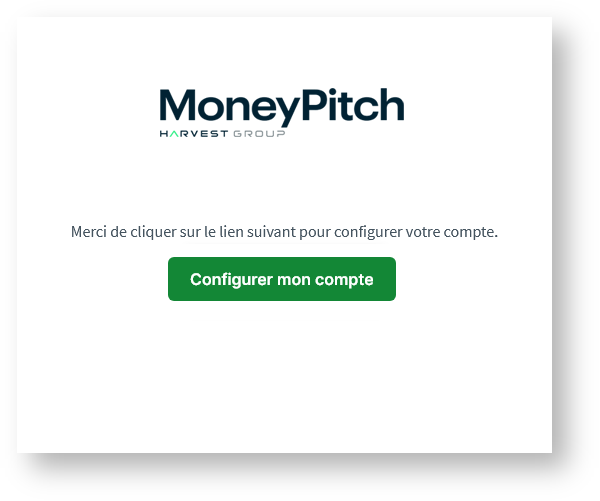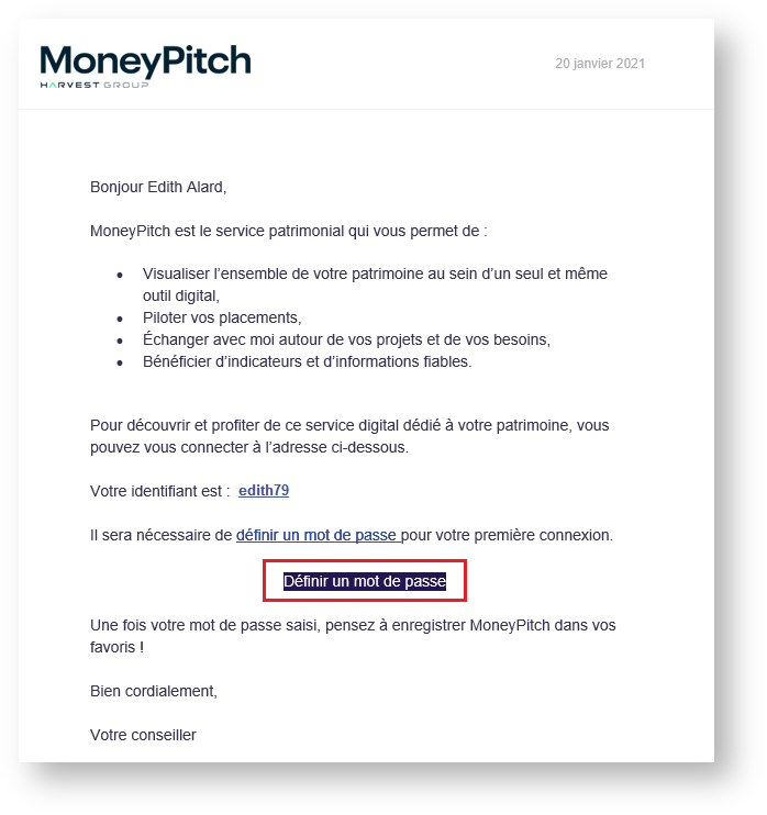 Lorsque votre conseiller vous accorde un accès à MoneyPitch, vous recevez un mail vous indiquant votre identifiant. Un lien vous invite à créer votre mot de passe.