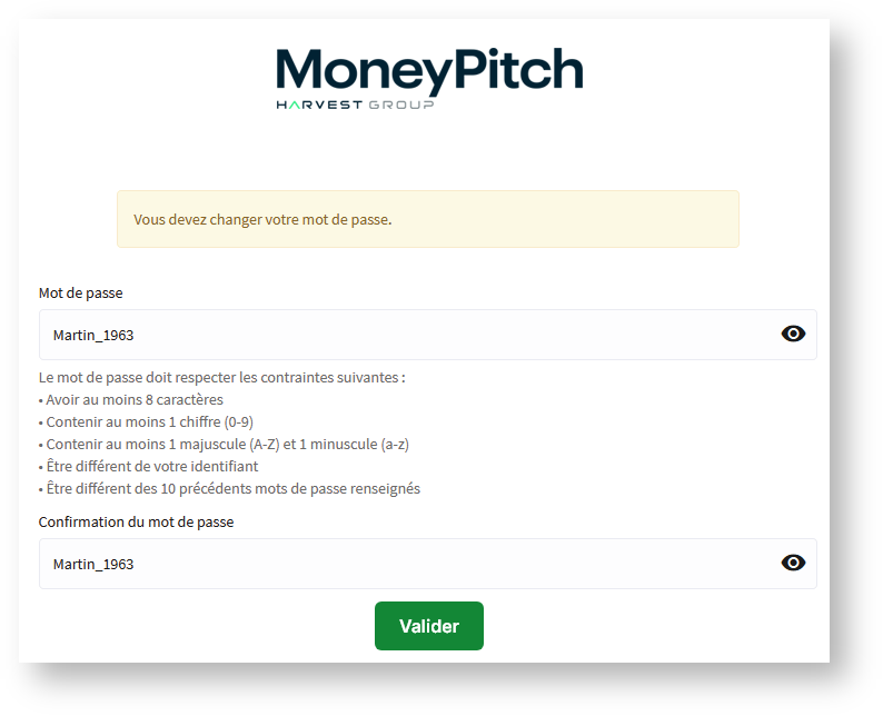 Dans MoneyPitch, vous pourrez changer votre mot de passe à votre convenance quand vous le souhaitez depuis la page de connexion.